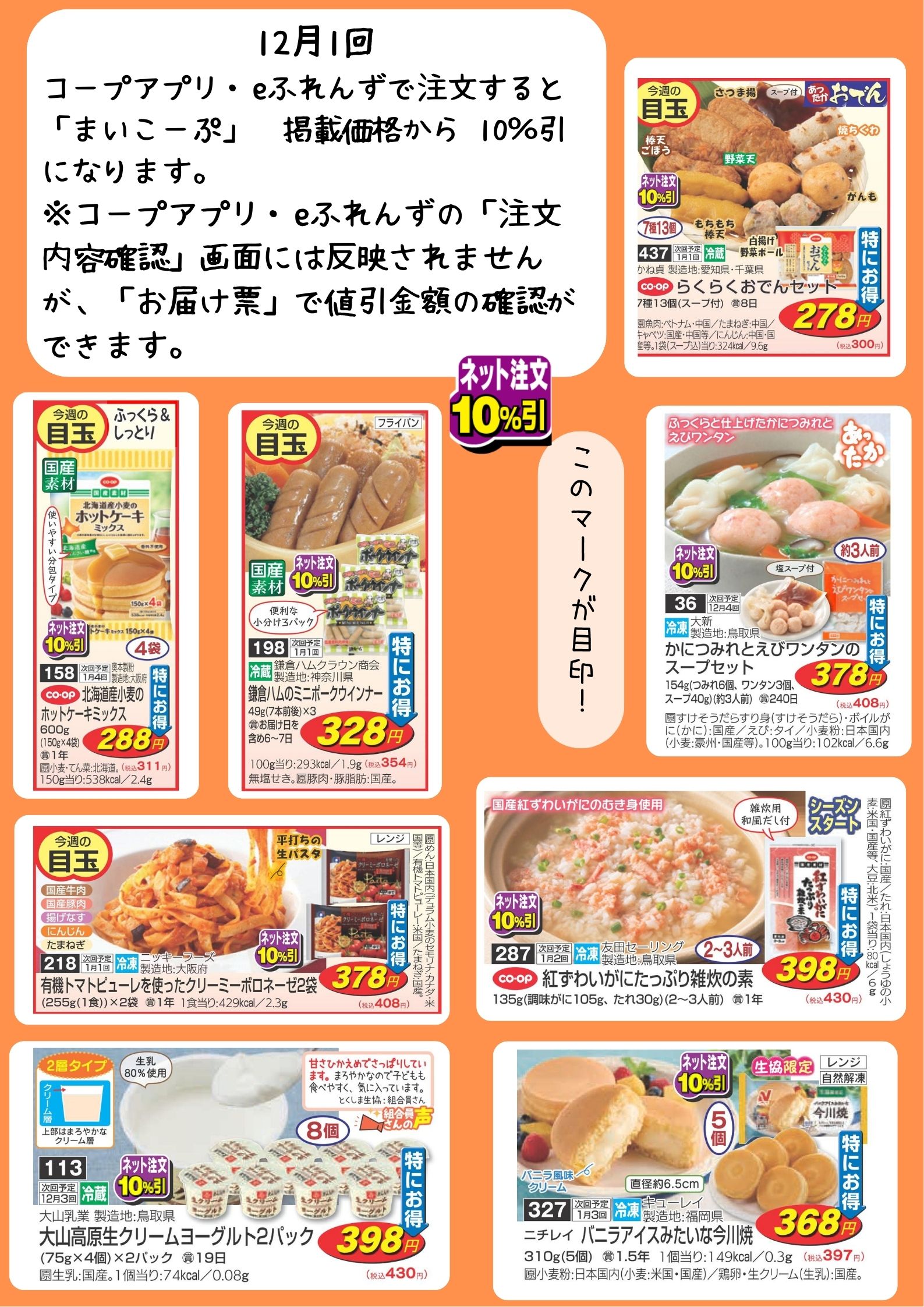 ☆月曜日配送・火曜日配送の方は、年内(12/29.30)に紙の注文書をご提出いただきますが、注文書を提出した後でもコープアプリ・eふれんずから1月2回の商品を注文する事が出来ます。お買い物忘れ・追加の注文にぜひご活用ください。