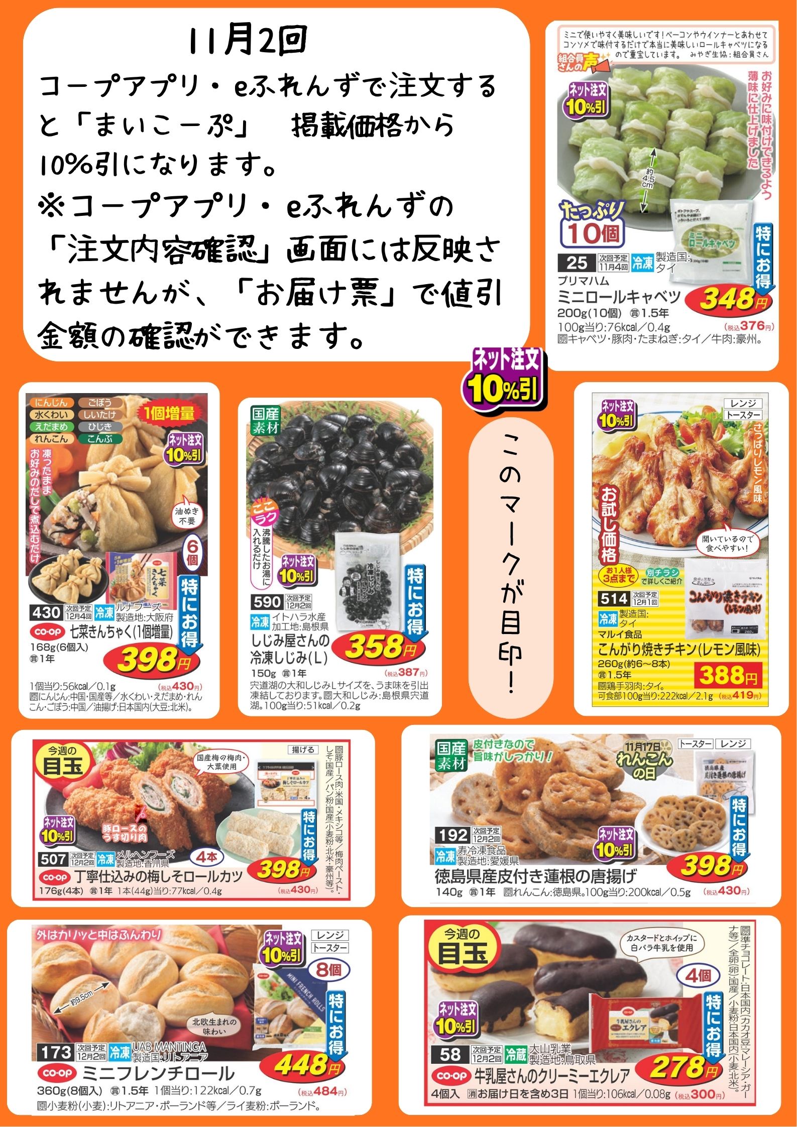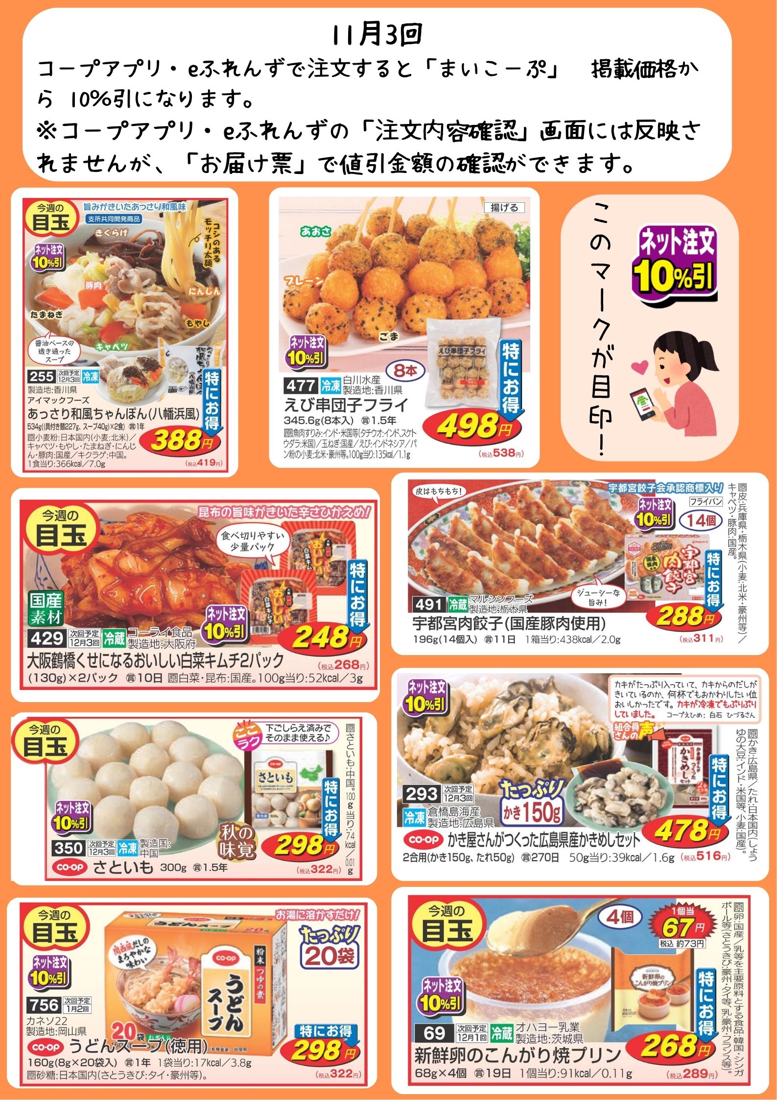 ②11月2回カタログまいこーぷに隠された、王冠を被った特別な「ネット注文10%」マークがついた商品を見つける。